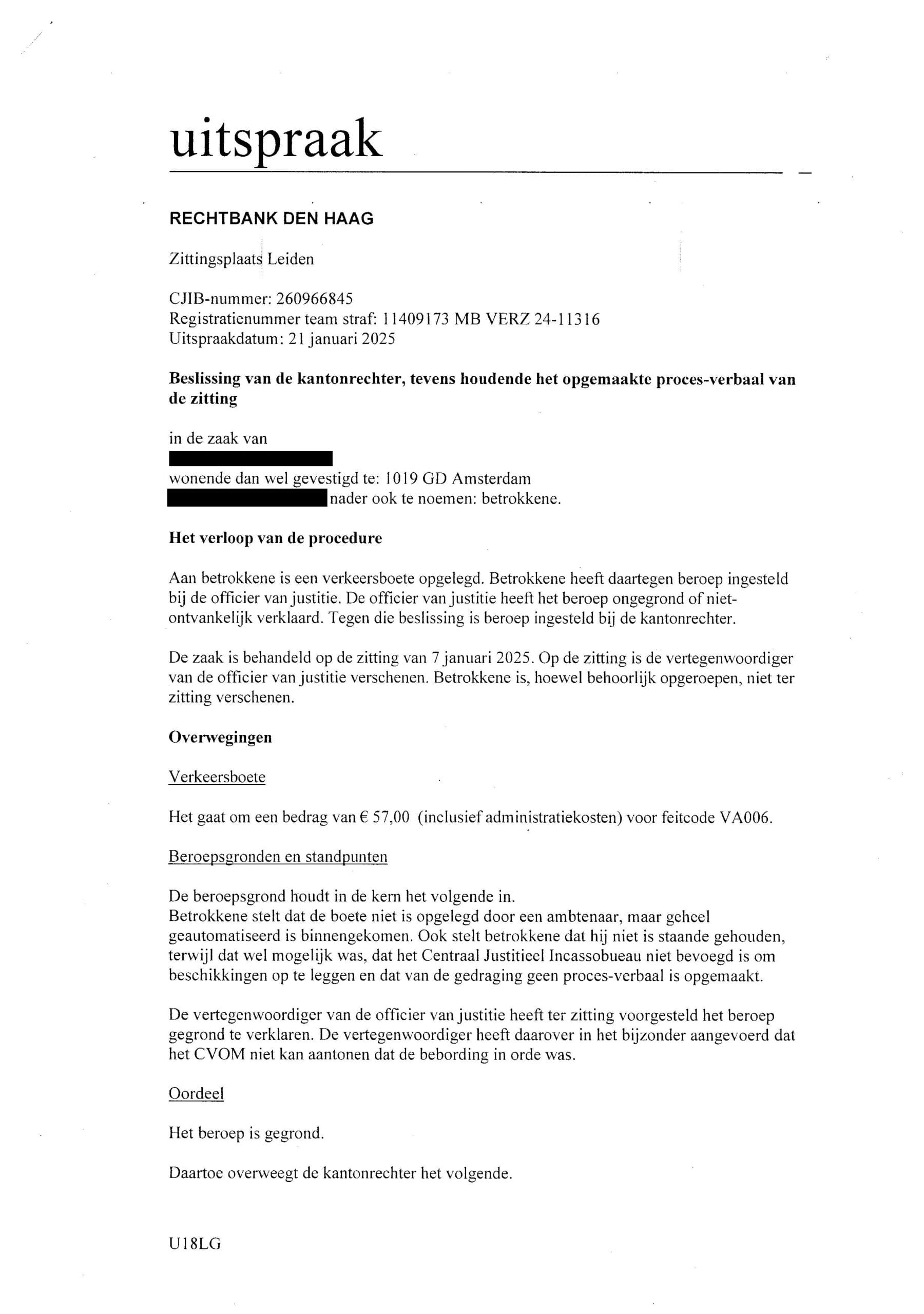 Tijdens de zitting (7 januari) was ik in Spanje. De uitspraak volgde op 21 januari.